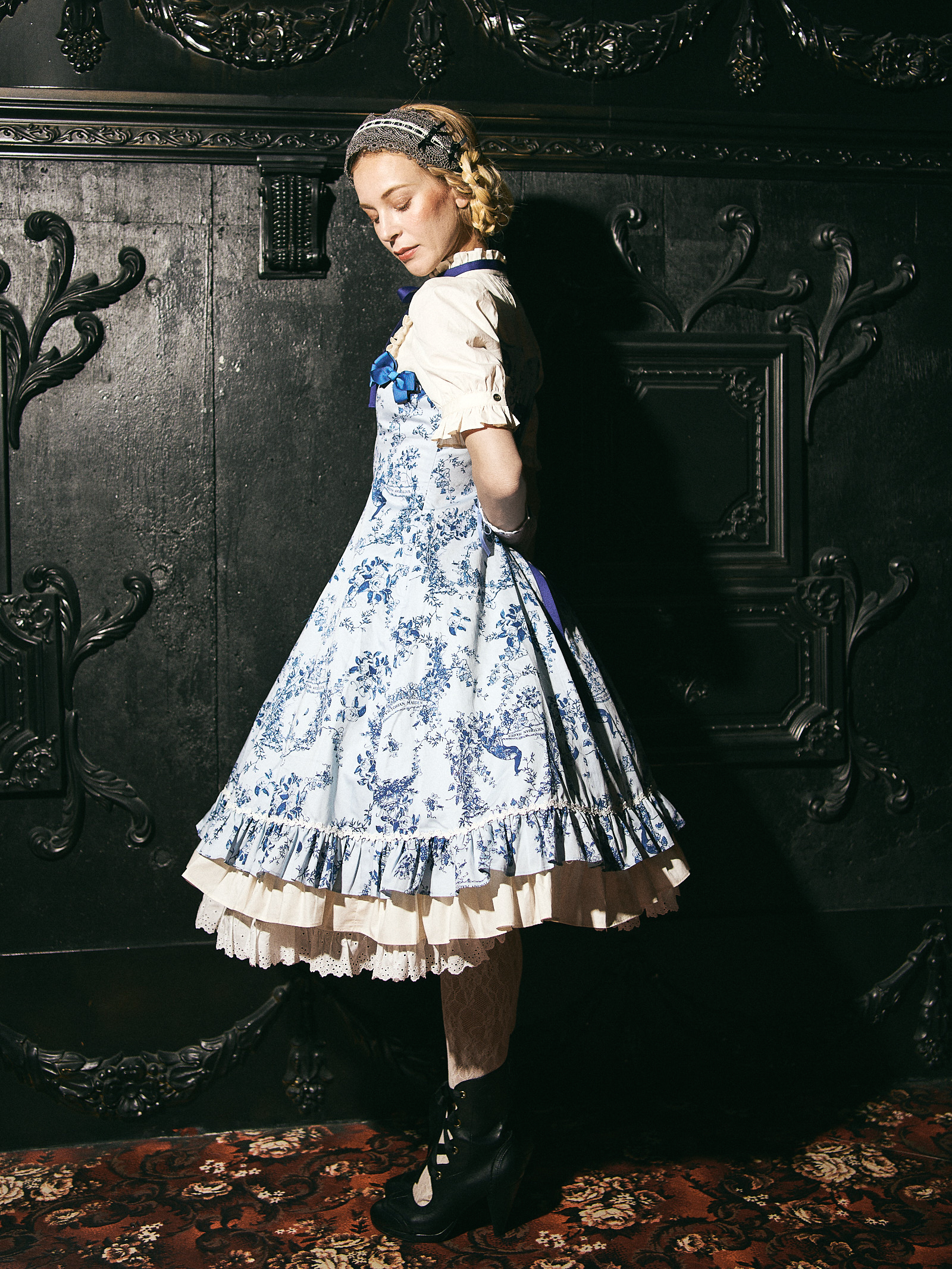 グレー ロリータドレス フリル付き 海外ブランド フルセット タグ付き ウサギとキティプリントのシルバーグレーショートパフスリーブ